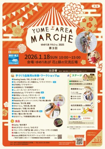 イベント【山形イベント情報1/18】ゆめりあマルシェ2025 第3回(新庄市)2026年1月18日(日)に、新庄市で「ゆめりあマルシェ2025 第3回」が開催されます。 ゆめりあマルシェ2025 第3回 『ゆめりあマルシェ2025
