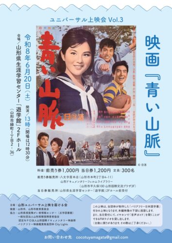 イベント【山形イベント情報6/20】映画『青い山脈』ユニバーサル上映会 Vol.3(山形市)2026年6月20日(土)に、山形市で「映画『青い山脈』ユニバーサル上映会 Vol.3」が開催されます。 イベント情報フォームよりご応募い