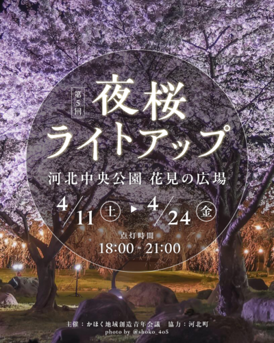 NEWイベント【山形イベント情報4/11-4/24】第5回 河北中央公園 夜桜ライトアップ(河北町)2026年4月11日(土)から24日(金)まで、「第5回 河北中央公園 夜桜ライトアップ」が開催されます。 イベント情報フォームよりご応