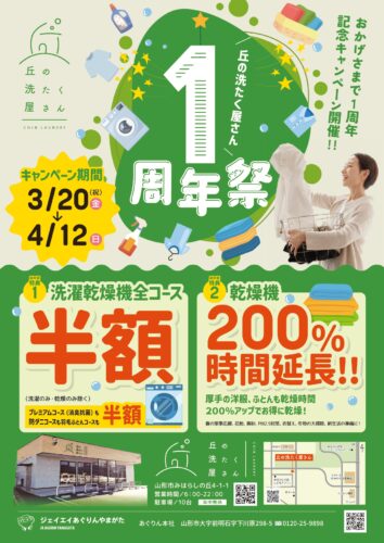 NEWイベント【山形イベント情報3/20-4/12】丘の洗たく屋さん1周年祭(山形市)2026年3月20日(金祝)から4月12日(日)に、山形市で「丘の洗たく屋さん1周年祭」が開催されます。 イベント情報フォームより応募い