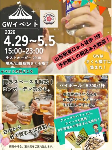 NEWイベント【山形イベント情報4/29-5/5】GWはやまがた駅前さくら横丁へ!ビアガーデン気分やスイーツも味わえちゃう!こんにちは。ライターのキュキュマルです。 今年のゴールデンウィークの予定はもう決まりましたか? 山形駅前にあります昨年オー