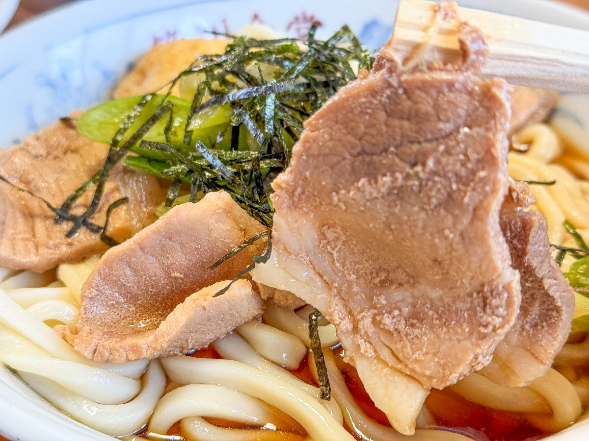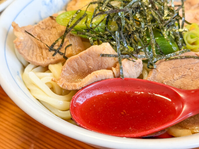 上には豚肉+ねぎ+刻み海苔、さらにお揚げがのっていて見た目からして満足感高めです。