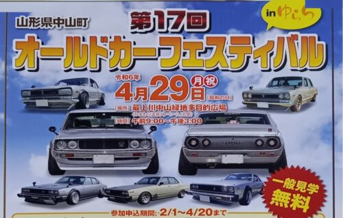 イベント【山形イベント情報4/29】第17回オールドカーフェスティバル in ゆらら(中山町)が開催されます! 憧れの旧車にまた会えるかもしれないイベントが中山町で開催されるそうです。 第17回オールドカーフェスティバル in ゆらら