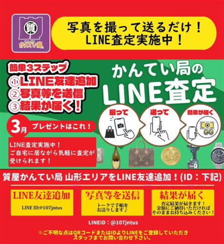 NEWやまぐらパートナー【やまぐらピックアップ】撮って、送って、待つだけ。質屋かんてい局のLINE査定が簡単すぎる!「やまぐらパートナー」からのおすすめ情報を紹介する「やまぐらピックアップ」! 質屋かんてい局山形北店さんからのお知らせで
