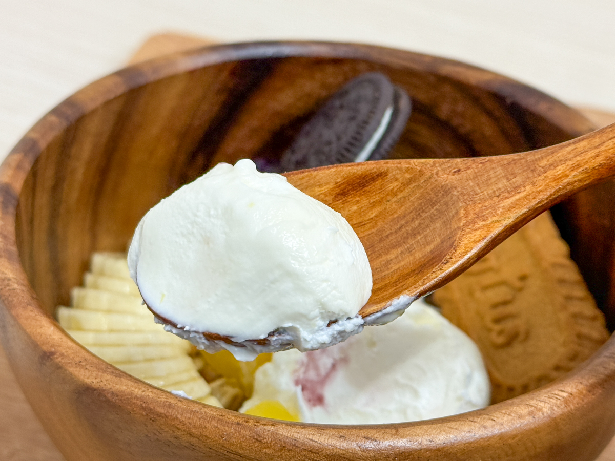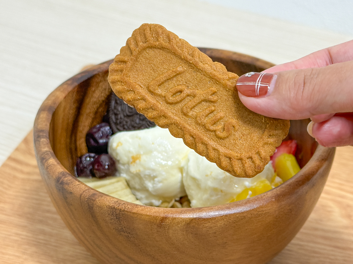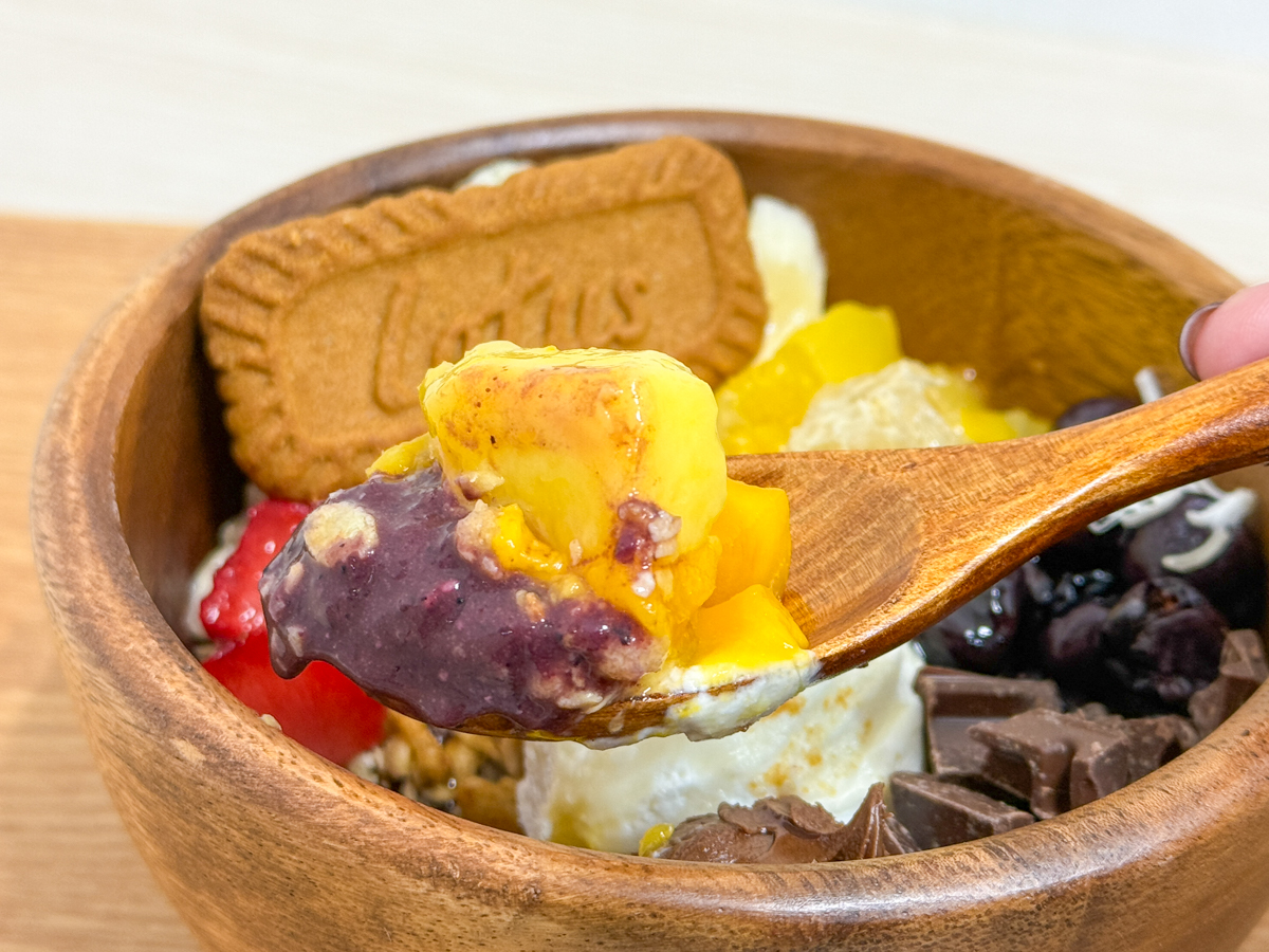 バナナ、イチゴ、マンゴー、ブルーベリーに加え、ロータスやオレオなどのトッピングで見た目も華やかです。