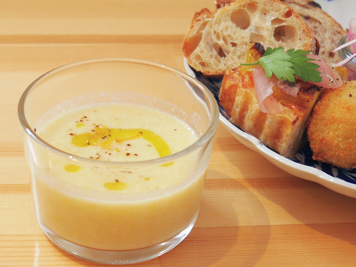このポタージュとパンを一緒に食べるのがおすすめです。