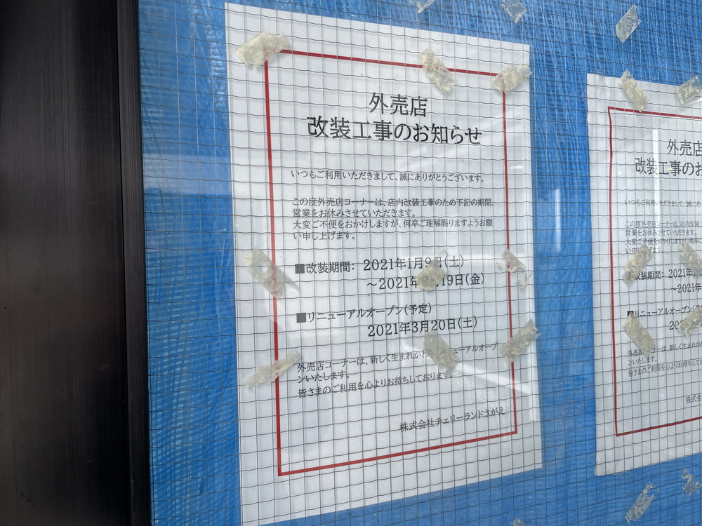 取材の途中、ふらっとチェリーランドに寄ったところ、外売店エリアにこんな張り紙が…。