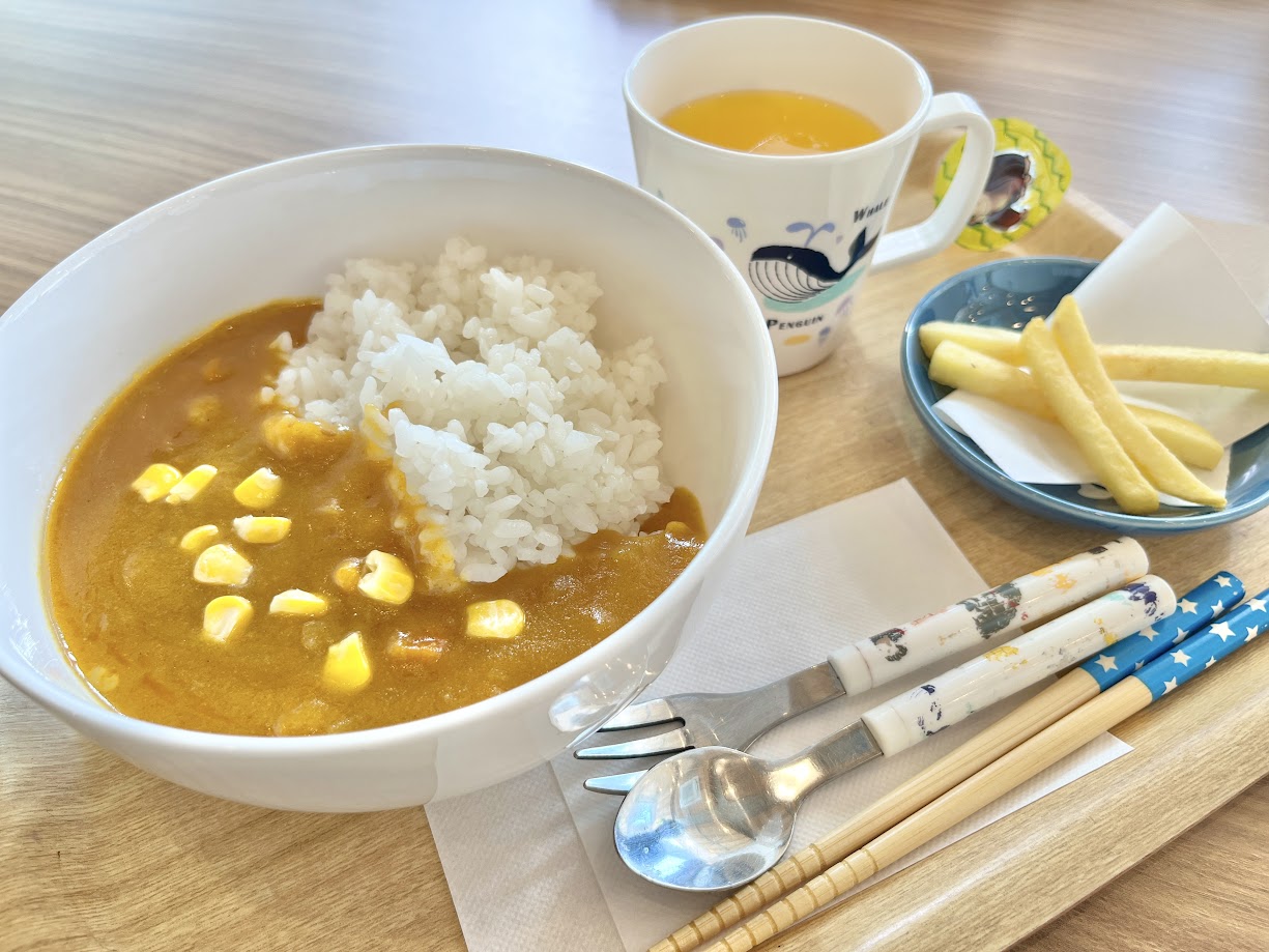 まずこちらが「おこさまカレー」です。ジュースはオレンジとアップルから選べました。