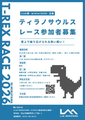 イベント【山形イベント情報2/15】ティラノサウルスレース in Link MURAYAMA 2026(村山市)2026年2月15日(日)に「ティラノサウルスレース in Link MURAYAMA 2026」が開催されます。 ティラノサウルスレース in Link MURAYAMA 2026 全国各
