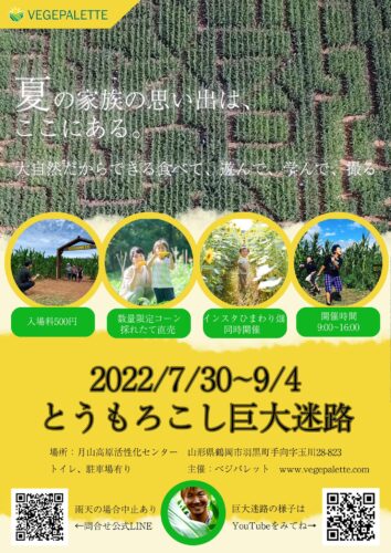 イベント【山形イベント情報7/30~】とうもろこし巨大迷路(鶴岡市月山高原) 7/30(土)~9/4(日)の間、鶴岡市の月山高原に親子で大自然を満喫できる「とうもろこし巨大迷路」が出現します。 ベジパレット公式