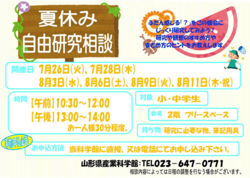 イベント【山形イベント情報 7/26,28、8/3,6,9,11】夏休み自由研究相談が開催されます!!!(山形市城南町) 夏休みの自由研究で悩む人必見! 山形県産業科学館で夏休み自由研究相談が開催されます。 夏休み自由研究相談とは 夏休みの宿