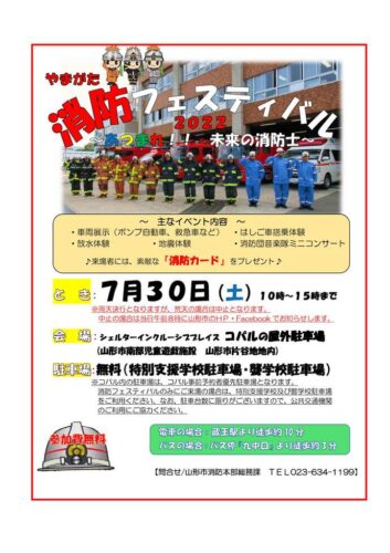 イベント【(7/30から延期になりました)山形イベント情報】やまがた消防フェスティバル2022~あつまれ!!未来の消防士~ 今般の新型コロナウイル感染拡大状況を鑑み、「やまがた消防フェスティバル2022~あつまれ!!未来の消防士~」は延期となって