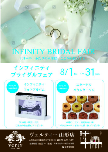 やまぐらパートナー【やまぐらピックアップ】特典満載のインフィニティブライダルフェア 「やまぐらパートナー」からのおすすめ情報を紹介する「やまぐらピックアップ」! 「ヴェルティー山形店」さんからのお知らせ