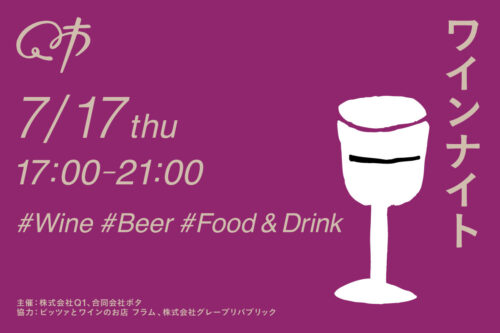 イベント【山形イベント情報】山形ワインとこだわりフードを満喫「Q市 ワインナイト」 2025年7月17日(木)17:00~21:00、やまがたクリエイティブシティセンターQ1にて、山形産ワインと多彩な料理が楽しめる「Q市 ワインナ