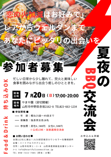 イベント【山形イベント情報7/20】夏夜のBBQ交流会(山形市) 2025年7月20日(日)に、山形市で「夏夜のBBQ交流会」が開催されます。 夏夜のBBQ交流会 日々の忙しさで 「出会いがない…」 「異