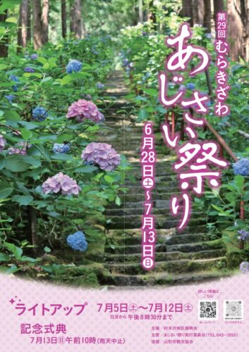 イベント【山形イベント情報6/28-7/13】第29回 むらきざわあじさい祭り(山形市) 2025年6月28日(土)から7月13日(日)の期間、「第29回 むらきざわあじさい祭り」が開催されます。 第29回 むらきざわあじさい祭