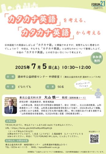 イベント【山形イベント情報7/5】FORUM21(公開講座)「『カタカナ英語』を考える、『カタカナ英語』から考える」(酒田市) 2025年7月5日(土)に、酒田市で「FORUM21(公開講座)」が開催されます。 FORUM21(公開講座)「『カタカナ英語』を考える、『カタカナ