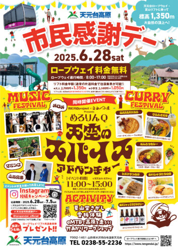 イベント【山形イベント情報6/28】市民感謝デー×同時開催「めろりんQ天空のスパイスアドベンチャー」(米沢市) 2025年6月28日(土)に、米沢市で「めろりんQ天空のスパイスアドベンチャー」が開催されます。 めろりんQ天空のスパイスアドベ