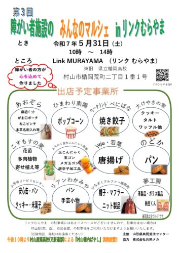 イベント【山形イベント情報5/31】障がい者施設の みんなのマルシェ in リンクむらやま(村山市) 2025年5月31日(土)に、村山市で「障がい者施設の みんなのマルシェ in リンクむらやま」が開催されます。 障がい者施設の みん