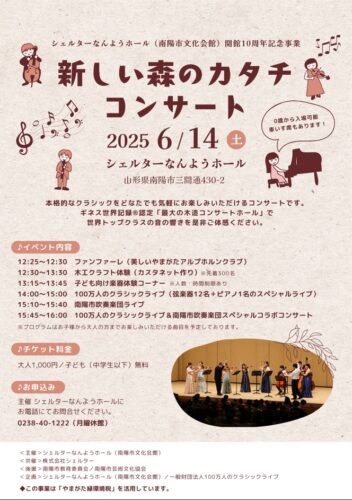 イベント【山形イベント情報6/14】新しい森のカタチ コンサート(南陽市) 2025年6月14日(土)に、シェルターなんようホールで「新しい森のカタチ コンサート」が開催されます。 新しい森のカタチ コン