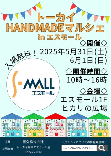 イベント【山形イベント情報5/31~6/1】トーカイHANDMADEマルシェinエスモール(鶴岡市) 2025年5月31日(土)と6月1日(日)に、鶴岡市で「トーカイHANDMADEマルシェinエスモール」が開催されます。 トーカイHANDMADEマルシ