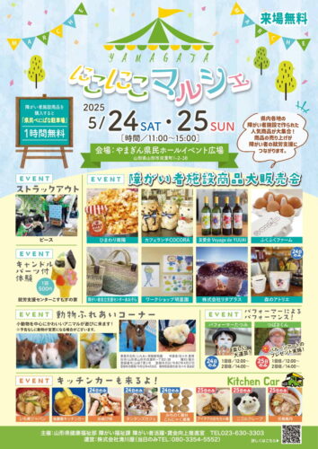 イベント【山形イベント情報】5/24(土)5/25(日)YAMAGATA にこにこマルシェが開催!! 山形県内各地の障がい者施設で作られた人気商品が大集合する【YAMAGATA にこにこマルシェ】が開催されます! やまぎん県民ホー