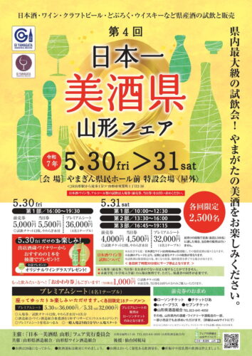 イベント【山形イベント情報】5/30(金)5/31(土)日本一美酒県 山形フェアが開催!! 県内最大級の試飲会【日本一美酒県 山形フェア】がやまぎん県民前ホール特設会場(屋外)にて開催されます! やまぎん県民