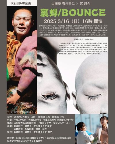 イベント【山形イベント情報3/16】大石田AIR公演『裏蝉 / BOUNCE』(大石田町) 2025年3月16日(日)に、大石田AIR公演『裏蝉 / BOUNCE』が開催されます。 大石田AIR公演『裏蝉 / BOUNCE』 大石田AIR公演『裏蝉 / BOUNCE』