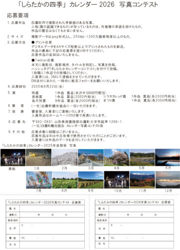 イベント【山形イベント情報】「しらたかの四季」カレンダー2026 写真募集(白鷹町) 「しらたかの四季」カレンダー2026 写真募集が始まりました。 「しらたかの四季」カレンダー2026 写真募集 次年度「しらたかの四