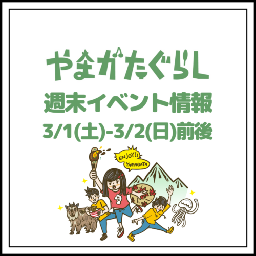イベント【山形週末イベント情報】3/1(土)〜3/2(日)前後のマルシェやイベント 週末のイベント情報をお届けです!!! イベント情報は「やまぐらパートナーからのお知らせ」の後にご紹介です。 延期や中止の