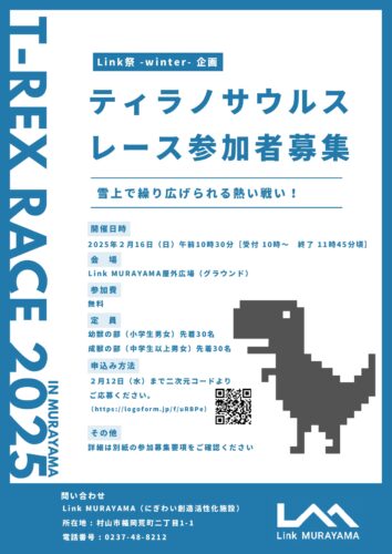 イベント【山形イベント情報2/16※2/12締切】ティラノサウルスレース in Link MURAYAMA 2025(村山市) 2025年2月16日に、村山市で「ティラノサウルスレース in Link MURAYAMA 2025」が開催されます! ティラノサウルスレース in Link MURAYAMA 202
