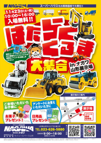 イベント【イベント情報 11/23(土)】働く車もやってくる!家族みんなで特別な秋の1日を楽しもう!|ナガワ山形展示場 ユニットハウスでお馴染みのナガワ山形展示場で11月23日(土)~29日(金)までセールを開催中! また、11月23日(土)限定で家族みん