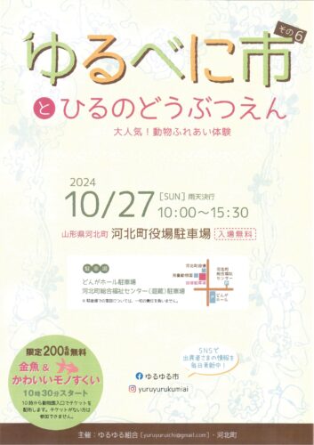 イベント【山形イベント情報10/27】ゆるべに市その6とひるのどうぶつえん(河北町) 2024年10月27日(日)に、河北町で「ゆるべに市その6とひるのどうぶつえん」が開催されます! ゆるべに市その6とひるのどうぶつ