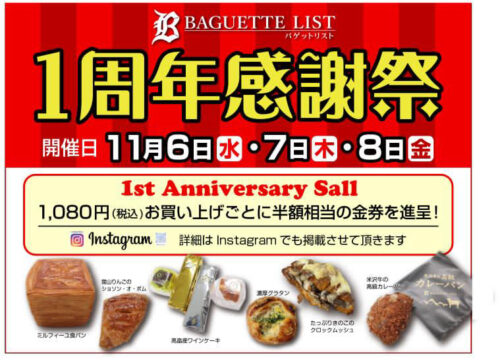 イベント【山形イベント情報11/4~11/8】Baguette List オープン一周年感謝祭(米沢市) 2024年11月4日(月祝)から、米沢市のBaguette List で「オープン一周年感謝祭」が開催されます! ※期日によってイベント内容が異な