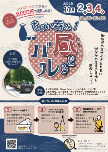 イベント【山形イベント情報11/2~4】ちょい吞み!昼どきバル(山形市七日町) 2024年11月2日~4日に、山形市七日町で「ちょい吞み!昼どきバル」が開催されます! ちょい吞み!昼どきバル 水の町屋七日町御殿