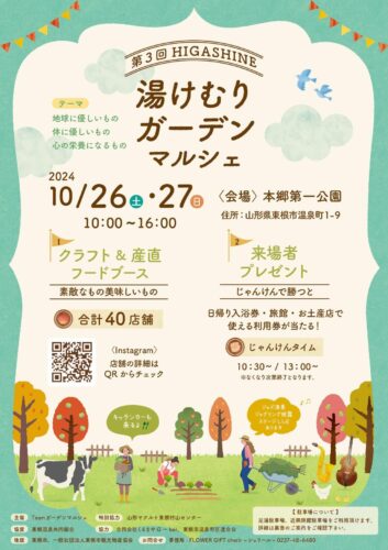 イベント【山形イベント情報10/26.27】湯けむりガーデンマルシェ2024(東根市) 2024年10月26日(土)と27日(日)に、東根市で「湯けむりガーデンマルシェ2024」が開催されます! 湯けむりガーデンマルシェ2024 お