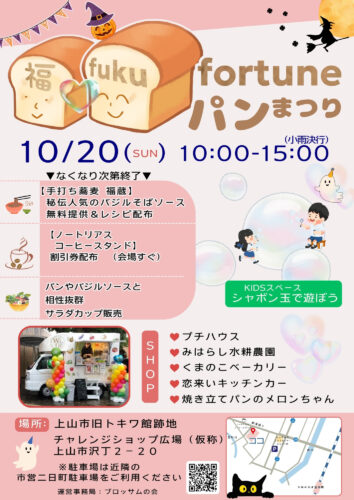 イベント【山形イベント情報10/20】fuku☓福☓fortune パンまつり(上山市) 2024年10月20日(日)に、上山市で「fuku☓福☓fortune パンまつり」が開催されます! fuku☓福☓fortune パンまつり 【福☓fuku fortune パ