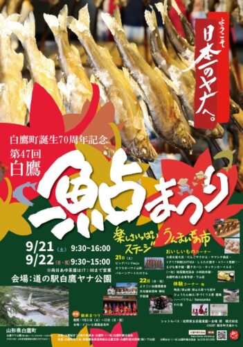イベント【山形イベント情報9/21.22】第47回白鷹鮎まつり(白鷹町) 2024年9月21日、22日に、白鷹町で「第47回白鷹鮎まつり」が開催されます! 第47回白鷹鮎まつり 9月21日(土)・22日(日・祝)の2日間