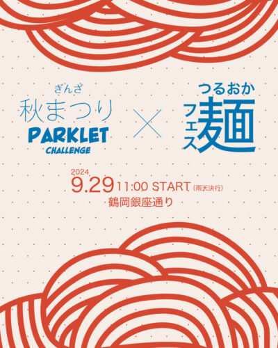 イベント【山形イベント情報9/29】ぎんざ秋まつり・PARKLET CHALLENGE×つるおか麺フェス2024(鶴岡市) 2024年9月29日(日)、鶴岡市で「ぎんざ秋まつり・PARKLET CHALLENGE×つるおか麺フェス2024」が開催されます! ぎんざ秋まつり・PARKLET CHA