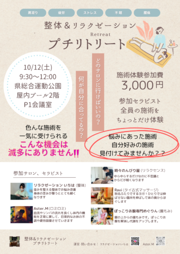 イベント【山形イベント情報10/12】整体&リラクゼーション プチリトリート(天童市) 2024年10月12日(土)、天童市で「整体&リラクゼーション プチリトリート」が開催されます! 整体&リラクゼーション プチリトリ
