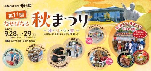 イベント【山形イベント情報9/28.29】第11回なせばなる秋まつり(米沢市) 2024年9月28日、29日に「第11回なせばなる秋まつり」が開催されます! 第11回なせばなる秋まつり 第11回目の開催となる「なせばなる