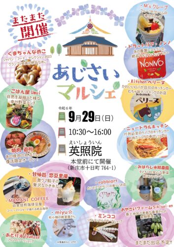 イベント【山形イベント情報9/29】新庄あじさいマルシェ(新庄市) 2024年9月29日(日)に、新庄市で「新庄あじさいマルシェ」が開催されます! 新庄あじさいまつり 9月29日 英照院にて 今年も「あじ