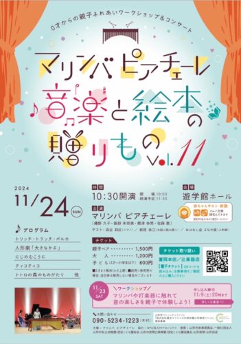 イベント【山形イベント情報11/24】0歳からのワークショップ&コンサート「音楽と絵本の贈りもの vol.11」 2024年11月24日、遊学館ホールで『0歳からのワークショップ&コンサート「音楽と絵本の贈りもの vol.11」』が開催されます! 0歳