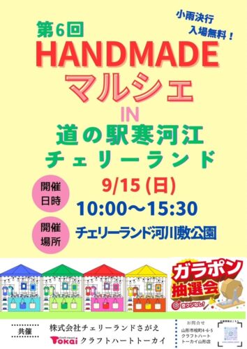 イベント【山形イベント情報9/15】第6回HANDMADEマルシェin道の駅寒河江チェリーランド(寒河江市) 2024年9月15日(日)に、「第6回HANDMADEマルシェin道の駅寒河江チェリーランド」が開催されます! 第6回HANDMADEマルシェin道の駅寒河