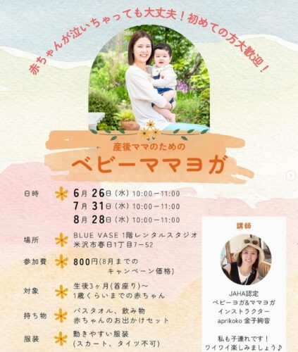 イベント【山形イベント情報6~8月】ベビーママヨガ教室aprikoko 米沢市で「ベビーママヨガ教室aprikoko」が開催されます! ベビーママヨガ教室aprikoko ママがほっとする♡ママの心に寄り添う