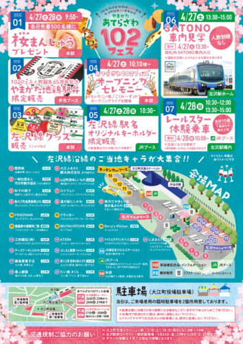 イベント【山形イベント情報4/27〜4/28】JR左沢線全線開通102周年 大江町誕生65周年記念 やまがた あてらざわ 102フェス 2024年4月27日〜28日、大江町JR左沢駅前広場にて「JR左沢線全線開通102周年 大江町誕生65周年記念 やまがた あてらざわ 102フェス」