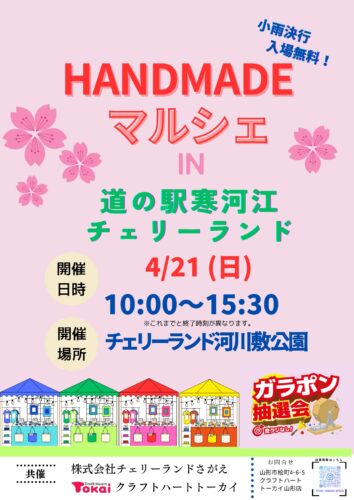 イベント【山形イベント情報4/21】第5回HANDMADEマルシェIN道の駅寒河江チェリーランド 2024年4月21日、寒河江市のチェリーランド河川敷公園にて「第5回HANDMADEマルシェIN道の駅寒河江チェリーランド」が開催されます。