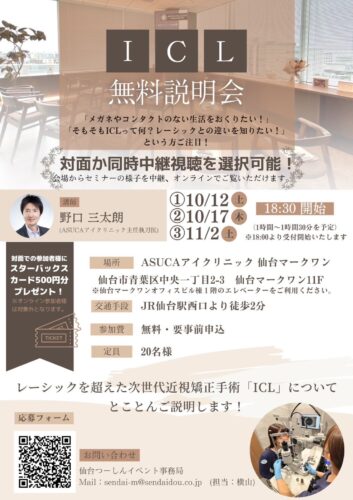 山形の話題【やまぐらピックアップ11/2】ICL(眼内コンタクトレンズ)の無料説明会を開催します! 「やまぐらパートナー」からのおすすめ情報を紹介する「やまぐらピックアップ」! ASUCAアイクリニックさんからのお知らせです!