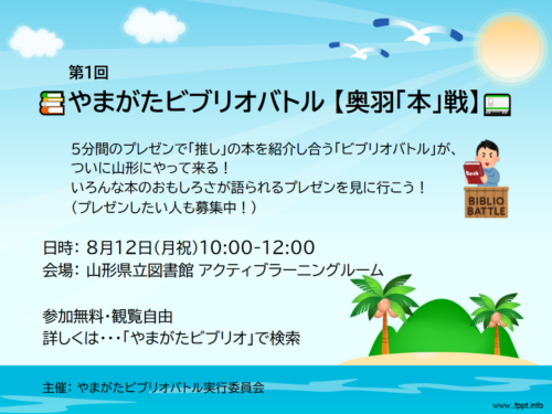 イベント【山形イベント情報8/12】やまがたビブリオバトル【奥羽「本」戦】 2024年8月12日に「やまがたビブリオバトル【奥羽「本」戦】」が開催されます! やまがたビブリオバトル【奥羽「本」戦】 5分間