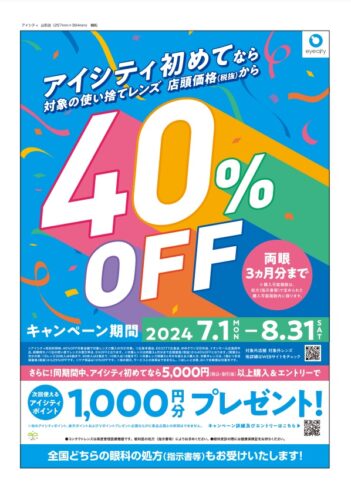 イベント【山形イベント情報~8/31】コンタクトのアイシティ山形店でお得なキャンペーン実施中! 2024年8月31日まで、アイシティ山形店でお得なキャンペーンを実施中です! コンタクトのアイシティ山形店でお得なキャンペーン
